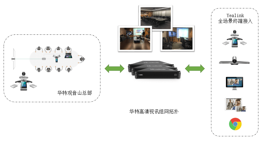 YMS+全場(chǎng)景終端,形成一整套完整的專業(yè)視頻會(huì)議解決方案,全面覆蓋各種會(huì)議場(chǎng)景,應(yīng)用范圍包含各種會(huì)議類型。華特總部\技術(shù)中心大型會(huì)議室終端VC800、全國(guó)基地\工程項(xiàng)目小型會(huì)議室終端VC200、一線員工手機(jī)APP、出差人員軟終端VCD/WebRTC,實(shí)現(xiàn)“大中小會(huì)議室、桌面辦公、移動(dòng)辦公”全場(chǎng)景覆蓋。除了華特內(nèi)部溝通,瀏覽器入會(huì)功能(出差員工只需用瀏覽器打開會(huì)議鏈接即可立即參會(huì)互動(dòng))有效滿足了出差人員與華特總部的隨時(shí)溝通需求。
